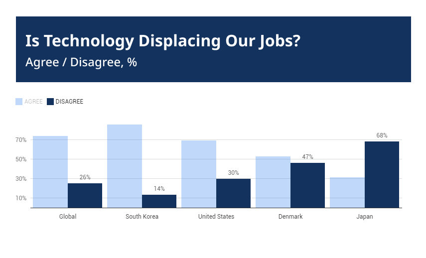 But there is another reason that can be formulated as a fear of progress. About 74% of respondents worldwide agree with the statement "Technology is replacing our jobs."