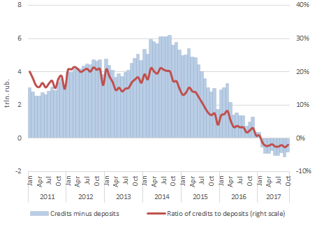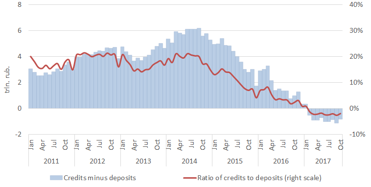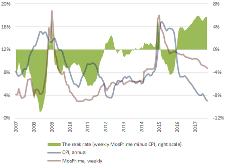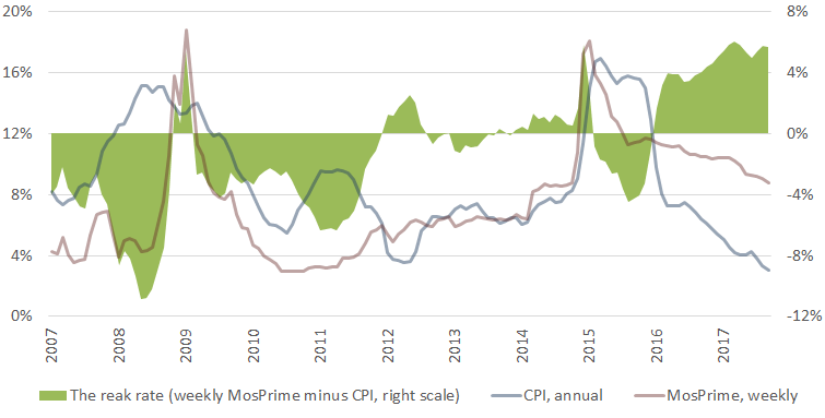 As a result, the real rate for the first time ever stays at a consistently high positive level, over 5%. This negatively affects economic development, increasing the cost of credits. Since early 2017, the volume of credits to legal entities (except for credit institutions) and individuals has already become less than the similar volume of deposits. In the banking sector, there is excess liquidity, but business does not seek to borrow at this high rate, especially in the face of declining inflation.