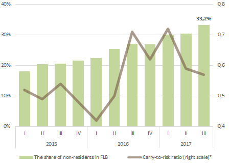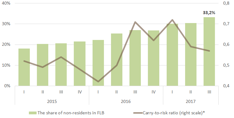 The cycle of monetary policy easing, which began in Russia since June 2016, reduced the difference between the rates. At the same time, a decrease in the volatility of the ruble had a more significant impact on the carry-to-risk ratio. As a result, the carry-to-risk ratio has only grown. In autumn 2017, the share of non-residents in Russian FLBs reached a record level of 33.2%. It is difficult to judge unambiguously how many of them buy FLB in the carry trade, but according to estimates their share is very significant. US sanctions do not limit the possibility of buying a sovereign debt of Russia, the decision will be made only in February next year.