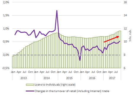 - The largest component of Russian GDP - trade - begins to slowly grow. However, this growth is due to an increase in credits to the population against its stagnant income.