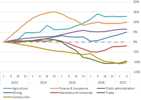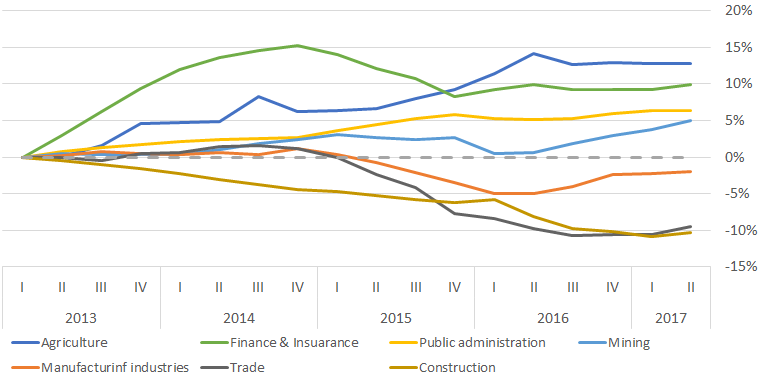 Considering the industries separately, one can see a multidirectional picture. Since 2012, the strongest growth was in agriculture, supported by the response to the sanctions and the fall of the ruble. Despite the accumulated since 2012 growth, Financial activity remains a lot below the 2014 levels.