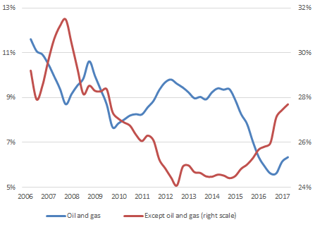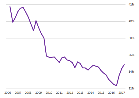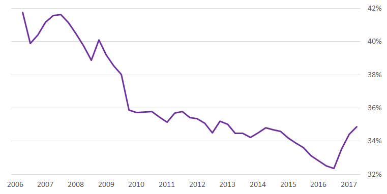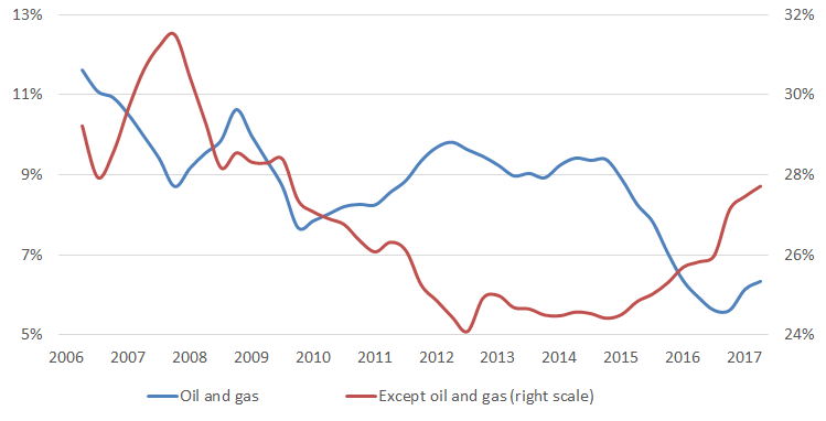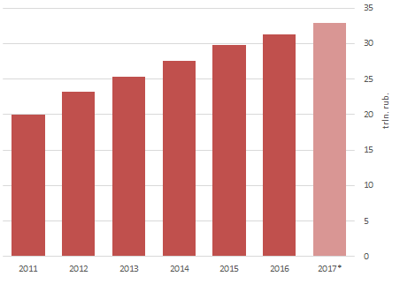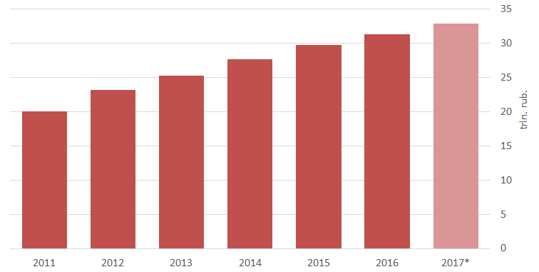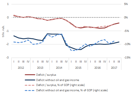 In 2016, the situation on the oil market stabilized, which, given the continued increase in the collection of taxes from other sectors, caused a sharp increase in the overall tax burden. Thus, at the end of 2016, a long-term trend of the reducing tax burden on the economy was broken. During the year it increased from 32.5% to almost 35% (second quarter of 2017), returning to the pre-crisis level.