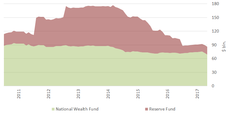 The Reserve Fund helped government to increase spending in the conditions of declining incomes, of which $75 billion was spent during the crisis. Currently, about $17 billion is left in the Reserve Fund. The Ministry of Finance announced that it intends to spend the Reserve Fund completely, and then to start spending money from The National Wealth Fund.
