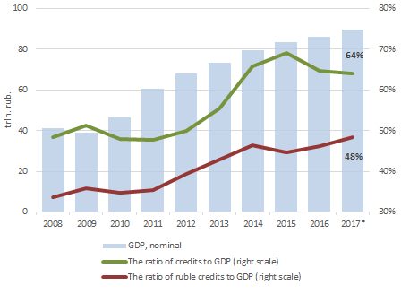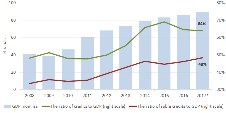 One of the key indicators of the development of the economy is its saturation with credits. In Russia, this indicator is quite low even in comparison with developing countries (Russian banking sector). This is due to the very strict policy of the Central Bank, both monetary and clearing the banking sector. Due to the high volatility of the ruble in the last four years, it is more correct to look at the dynamics of the ratio of ruble credits to GDP.