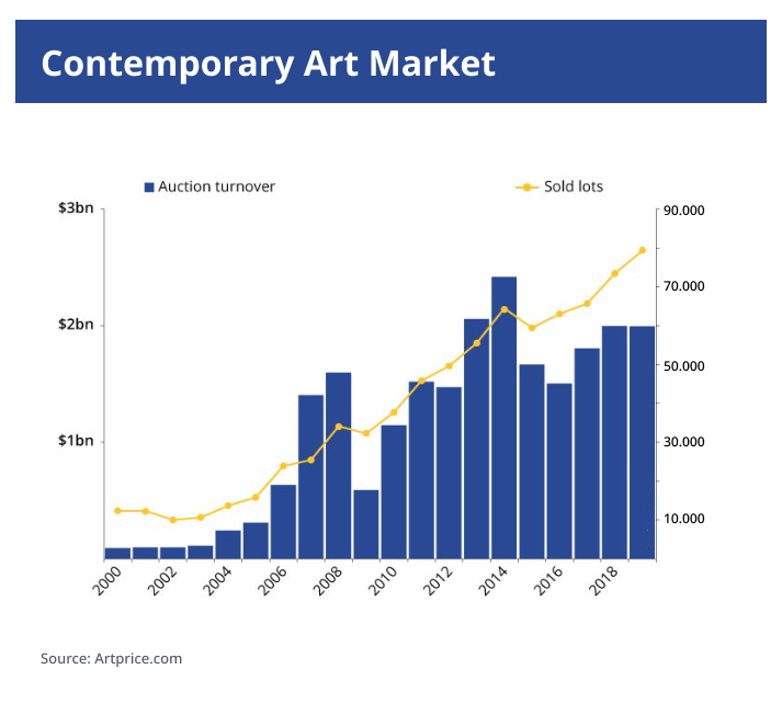 Prior to its first growth peak in 2008, the turnover of contemporary art grew by 1640% (2000-2008), but subsequently declined due to the US mortgage crisis and its global consequences.