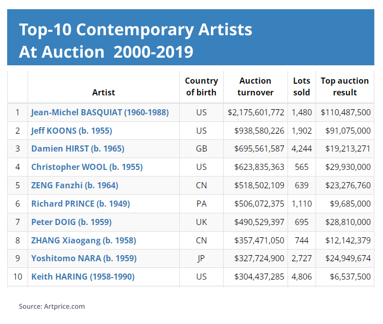 Moreover, almost 20% of the total global circulation of contemporary art over two decades comes from just four names: Basquiat, Koons, Hurst and Wool.
