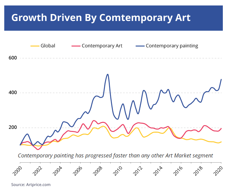 Contemporary art now accounts for 15% of the global art market compared to 3% 20 years ago. More than 60% of the contemporary art market is occupied by painting. In value terms, since 2000, works of contemporary art have generated 22.7 billion dollars.