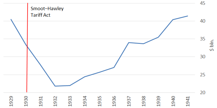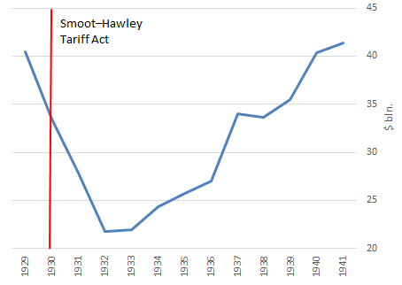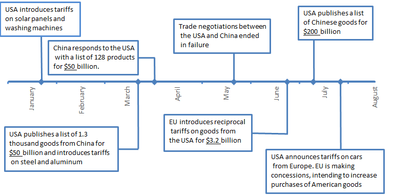 Strict protectionist measures of the USA are setting off a full-scale trade war. Similar things happened in the thirties of the twentieth century, when the USA, trying to fight the Great Depression, introduced tariffs on 20 thousand imported goods (the so-called Smoot-Hawley Tariff Act). This further worsened the economic situation of the USA, as it caused a symmetric reaction of their trading partners. After the introduction of the Act, U.S. exports reduced by more than 65% for two years and returned to its previous level only at the end of the 30s.