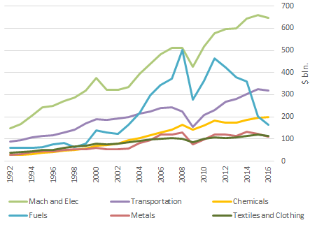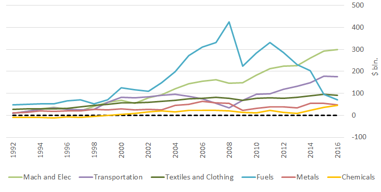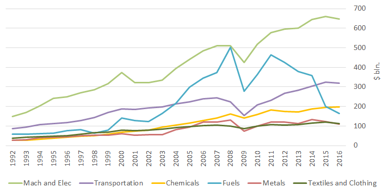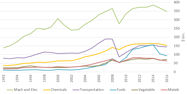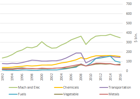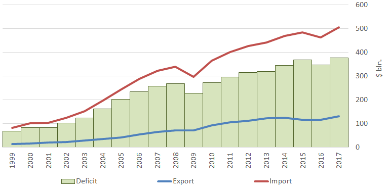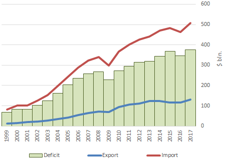 The dependence of the States on imports of machinery, equipment, transport and products of chemical industry is increasing. Even though these industries are the largest items of U.S. exports, after 2008 their volume stagnates, and import is steadily growing. For ten years, the total deficit for these items has grown more than two times.