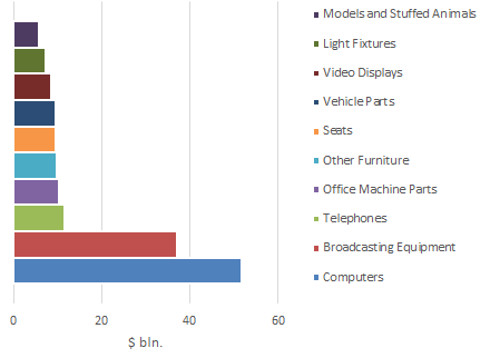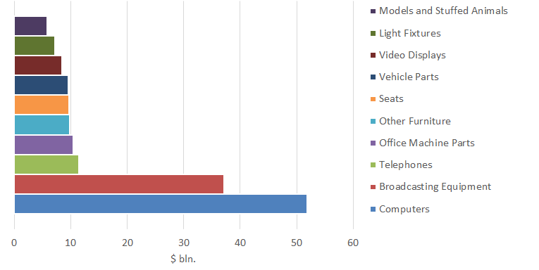 Ten largest items of trade exports of China to the USA (2016), 46% of total trade exports