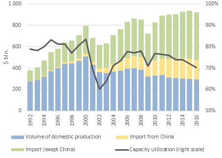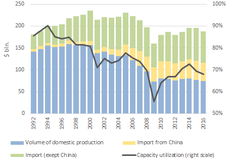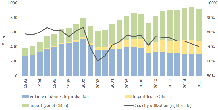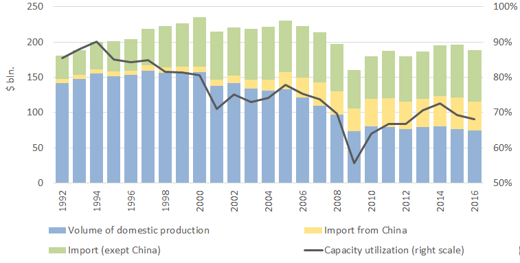 Will the USA be able to replace China in consumer goods? Consider one of the main branches of consumer demand – the manufacture of textile and clothing. Since China became a member of the WTO in 2001, domestic production in the USA has reduced twice; the capacity utilization has dropped from 85 to 70%. The cost of imports of textile and clothing from China to the USA in 2017 was $41 billion, while domestic U.S production was at the level of $74 billion. Thus, if the USA increases its own production to the level of the 1990s, they will be able to compensate for the entire volume of Chinese imports in this sector.