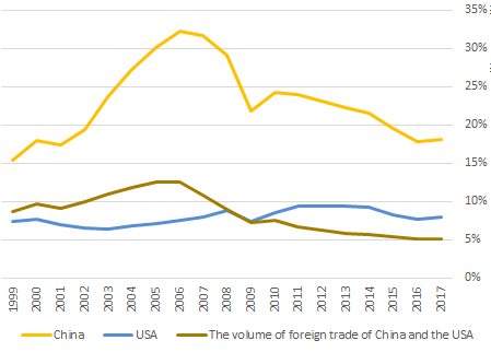 On the other hand, the USA has trade disagreements with half the world, and China – only with the USA. The trade ration with the USA in the Chinese economy is slightly above 5%.