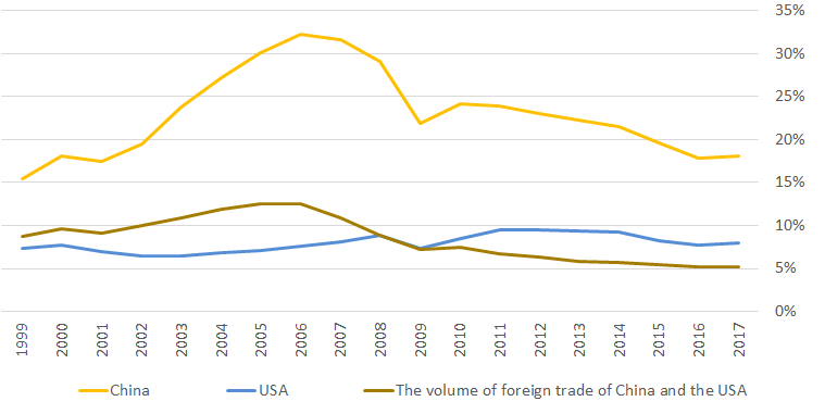 Volume of foreign trade (imports and exports) of the USA and China (all % of GDP)