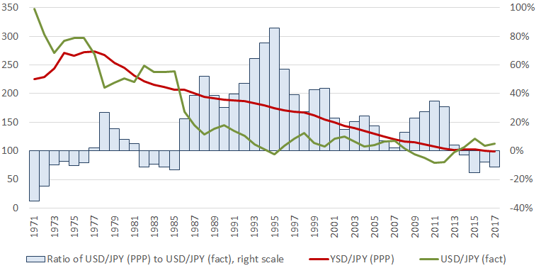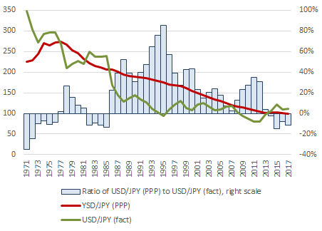 Actual rate of USD/JPY, rate of USD/JPY in purchasing power parity and their ratio