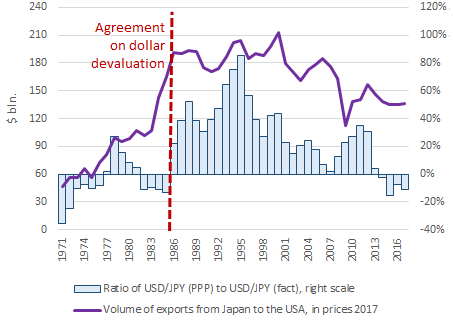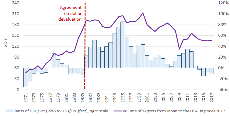 For example, the actual rate of JPY to the US dollar before 1985 fluctuated around the exchange rate calculated in purchasing power parity. In 1985, an agreement on the devaluation of the dollar (Economy of Japan), was reached between the USA and other developed economies, and JPY has become much more expensive than its purchasing power parity. This greatly affected the volume of Japanese exports to the USA – when from 1970 to 1985 the average annual increase in imports was 10.2%, further it did not exceed 0.6%. In recent years, the relationship between the rates has again become negative, but so far the Japanese exports do not show a growth trend.