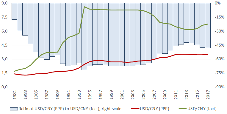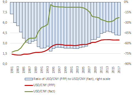 Actual rate of USD/CNY, rate of USD/CNY in purchasing power parity and their ration
