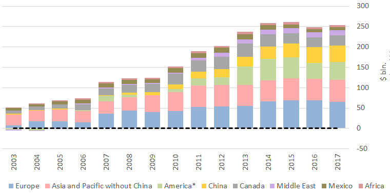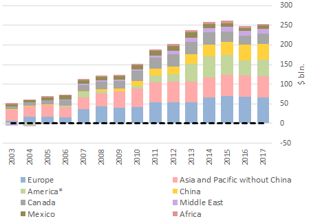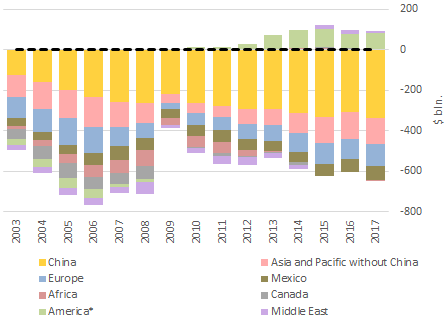 In recent years, U.S. foreign trade deficit as a whole remains at the same level, but the structure of the deficit by regions has considerably changed. Only the deficit with Europe, Mexico and Asia-Pacific (including China) remained stable. The deficit with all other regions became zero or turned into a surplus.