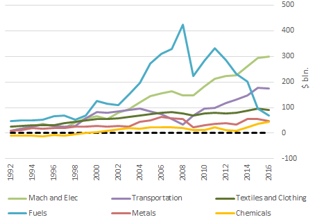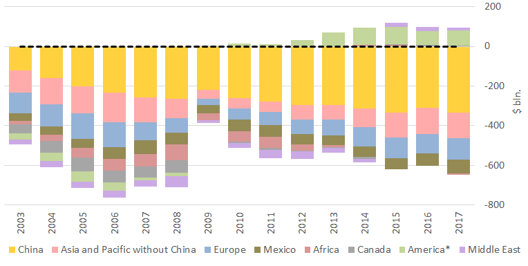 From the point of view of the trade industry balance, the USA has succeeded to reduce dramatically its main deficit – fuel – thanks to the revolution in the development of unconventional oil and gas fields. This explains the dramatic reduction in the deficit with the Middle East, Latin America and Africa.
