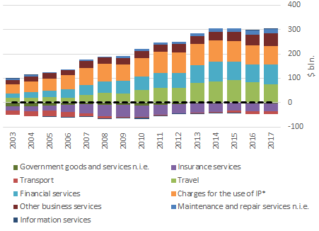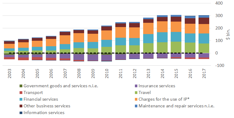 The volume of U.S. services exports is more than $300 billion, which is comparable to all Russian exports. The U.S. services balance is surplus with all regions and in almost all key sectors. Travel, financial services and the use of intellectual property provide the USA with over 77% of the total surplus in the services balance.
