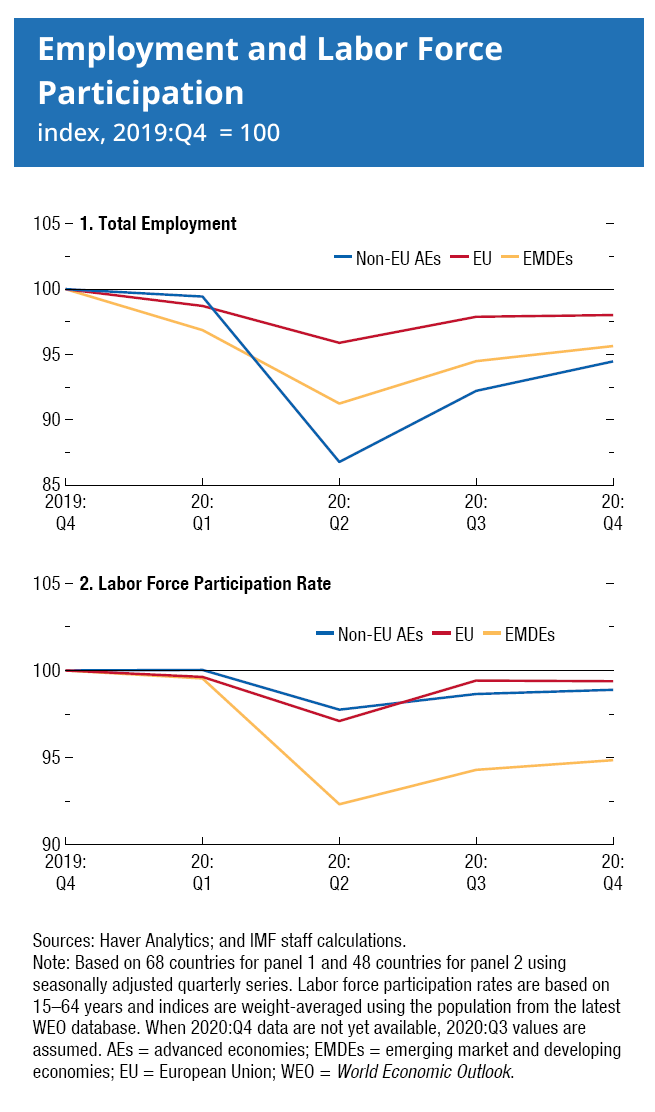 The proportion of the economically active population has also declined. The true extent of the decline in activity may be even greater than the indicators show, as many countries have introduced or expanded job retention programs (such as the Kurzarbeit program in Germany.